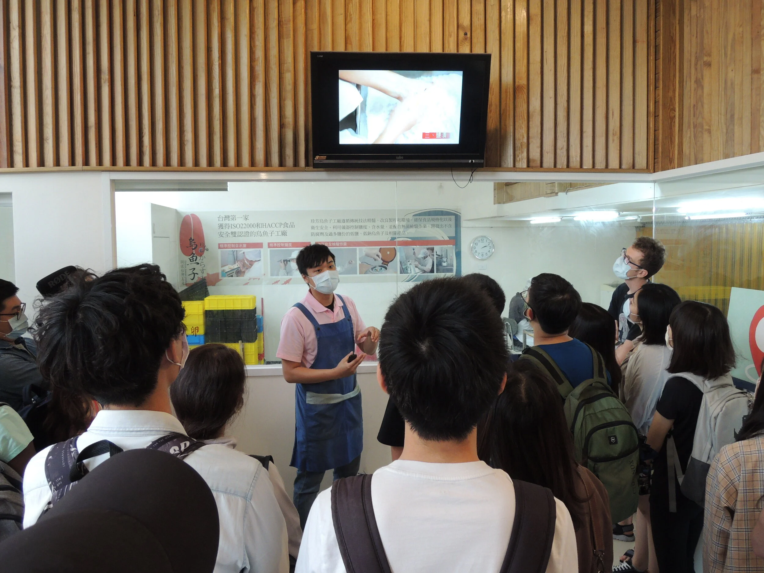 Wayne firstly introduced how mullet roes were produced and showed the production line. Then, he introduced the history and unique culture in the mullet roe industry. As one of the traditional industries in Taiwan, many interesting customs or taboos were left until today. Some symbols were explained in Taiwanese, which let the international students have more cognition on the industry.