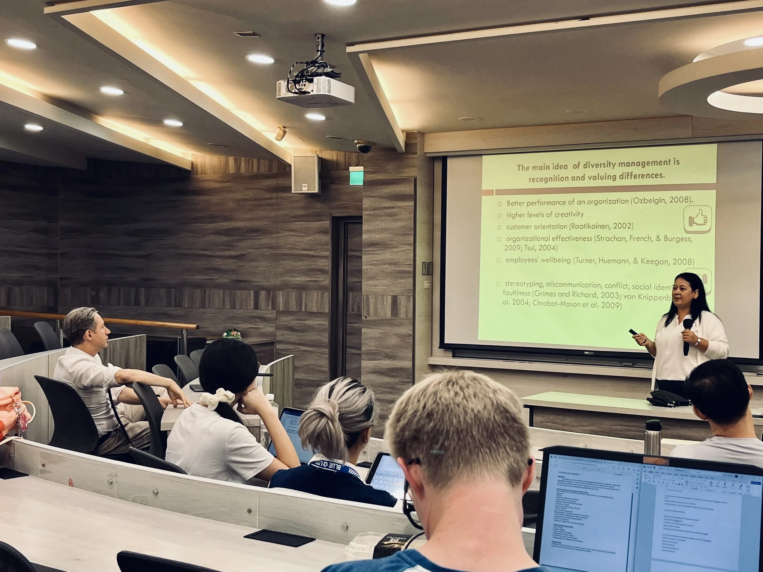 During her seminar, Dr. Achyldurdyyeva delved into a case study on Taiwan's semiconductor industry, a topic she later expanded upon in a book chapter titled “Diversity within Diversity Management.” She seamlessly blended academic research with tangible examples, offering attendees a deeper understanding of diversity's significance in professional settings. Initiating the discussion, Jennet prompted students to voice their perceptions of diversity. Answers varied from "people from diverse nations" and "various age groups" to encompassing "distinct cultures" and "genders." Expanding on these views, she introduced the concepts of visible and invisible facets of diversity, emphasizing the importance of acknowledging and valuing these differences for a thriving workplace environment.