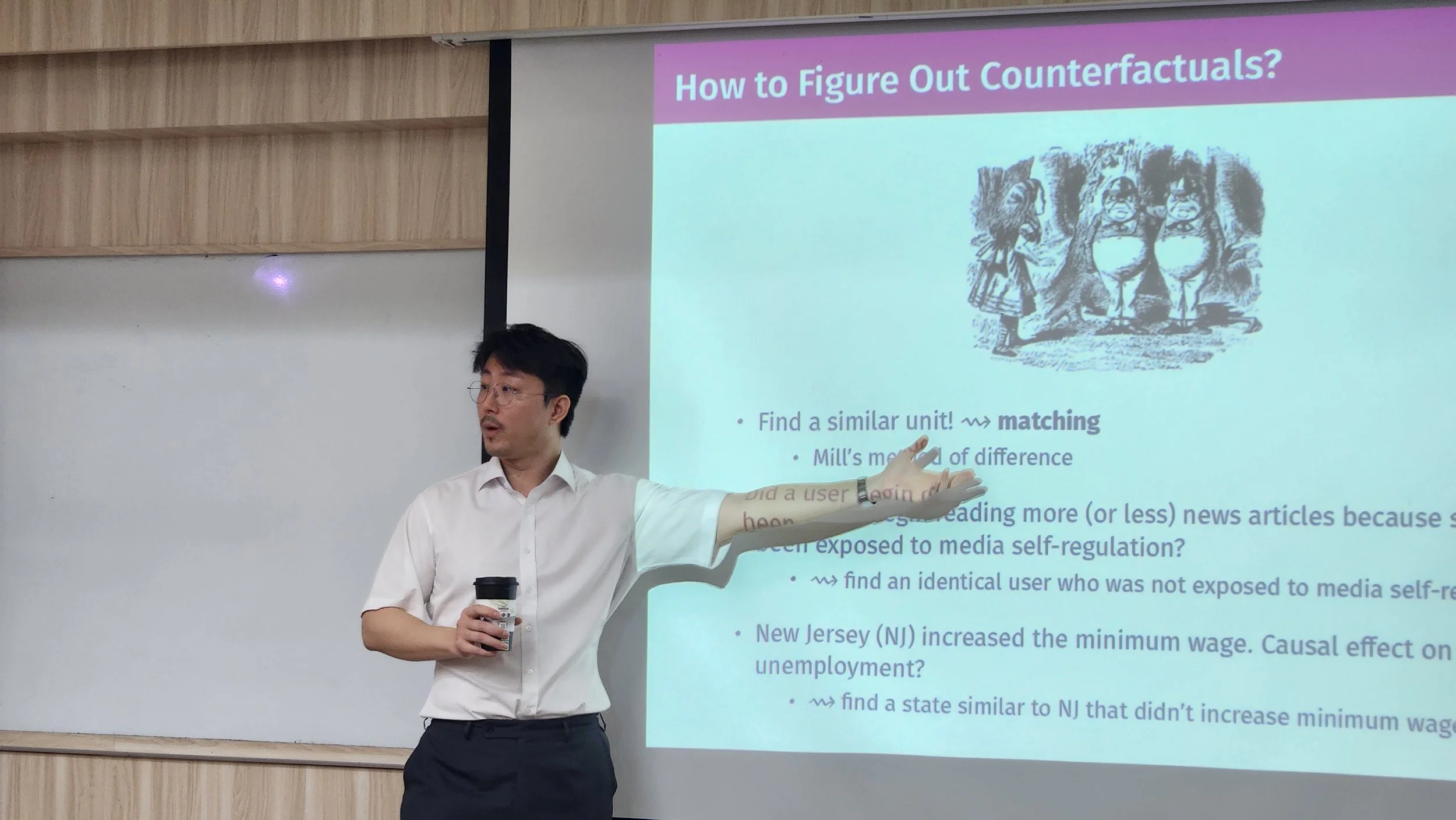 On May 20, 2024, Dr. Yoo Jaewon from NTHU delivered a lecture called “Empirical Causal Studies in IS” in Dr. Chen’s IBMBA MIS (management information systems) class. Dr. Yoo divided his lecture into two parts. The first part was about causal inference and the second used a causal study as an example to illustrate how to regulate content in digital media platforms.